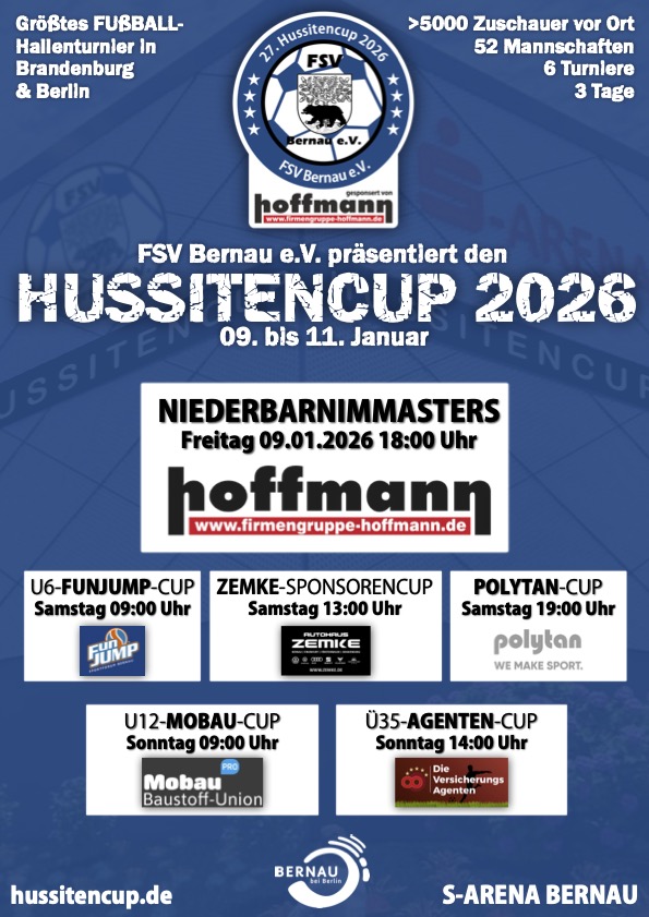 Vom 09. bis 11. Januar 2026 öffnet die S-Arena Bernau ihre Türen für das zweitgrößte Hallenturnier Ostdeutschlands: den 27. Hussitencup. Wir freuen uns auf ein Wochenende voller Leidenschaft, Sport und Gemeinschaft — mit sechs Turnieren, 54 Mannschaften und erwarteten über 5.000 Zuschauer:innen live vor Ort. FSV Bernau e.V.