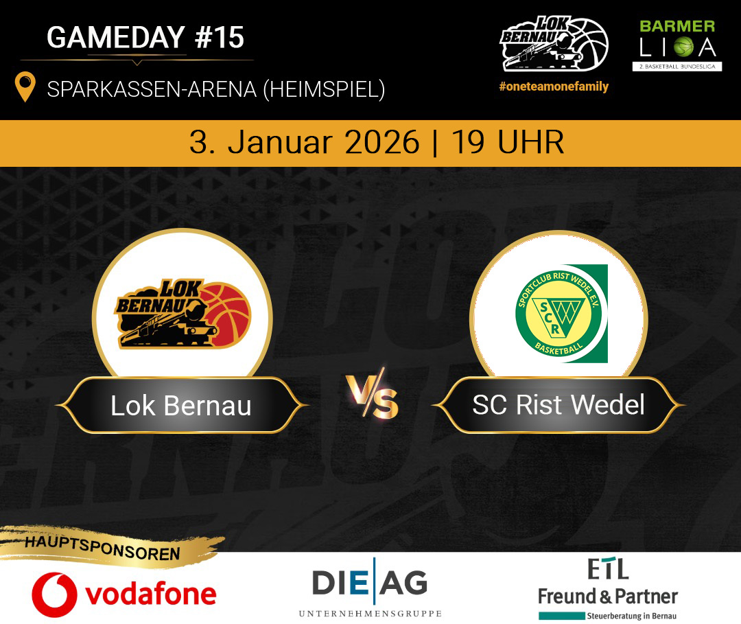 Am 3. Januar 2026 um 19:00 Uhr startet LOK Bernau mit einem Heimspiel gegen SC Rist Wedel ins neue Basketballjahr! Lasst uns gemeinsam mit voller Lautstärke ins neue Jahr starten – wir zählen auf eure Unterstützung! 🏀🔥
