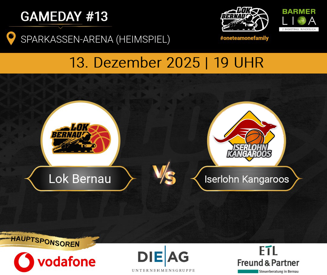 LOK Bernau vs. Iserlohn Kangaroos Am 13. Dezember 2025 um 19:00 Uhr heißt es wieder: Volle Halle, volle Power! Die Jungs von LOK Bernau wollen den nächsten Heimsieg – und brauchen euch dafür auf den Rängen! 💥
